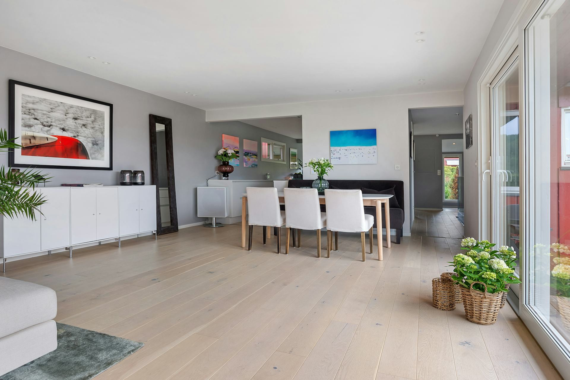 I moderne boliger, hvor køkken og stue ofte er ét stort rum, kan vinylgulve være med til at skabe en harmonisk helhed. Ved at vælge samme gulv i begge zoner får du et flydende og rummeligt udtryk, hvor overgangen mellem madlavning og ophold føles naturlig.